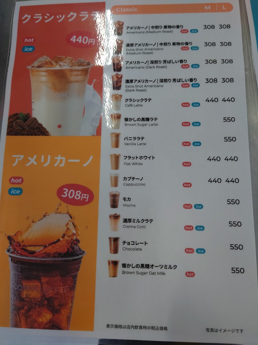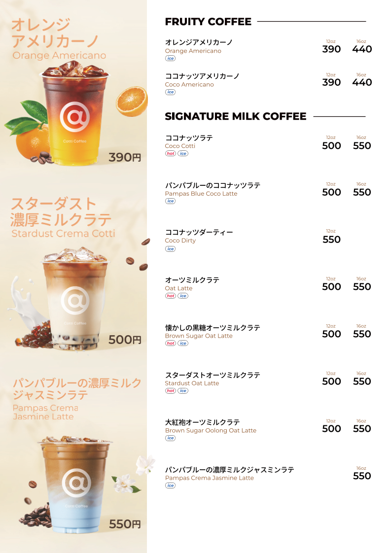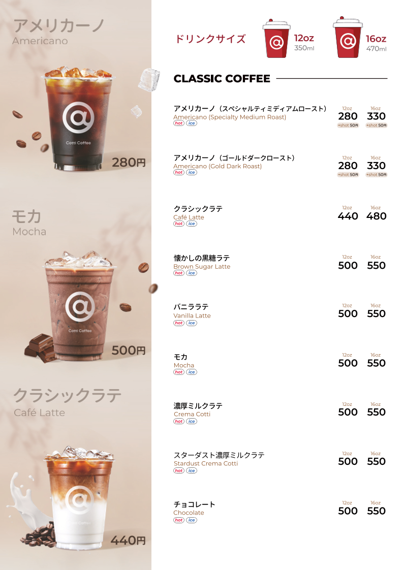 - Coffee and Specialty Beverages: Includes various coffee drinks and lattes, available in sizes around 500–550 yen, with options to customize sweetness.