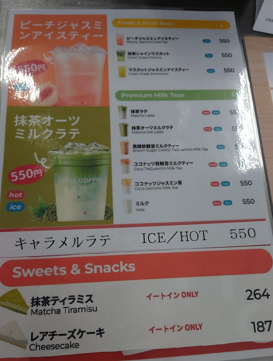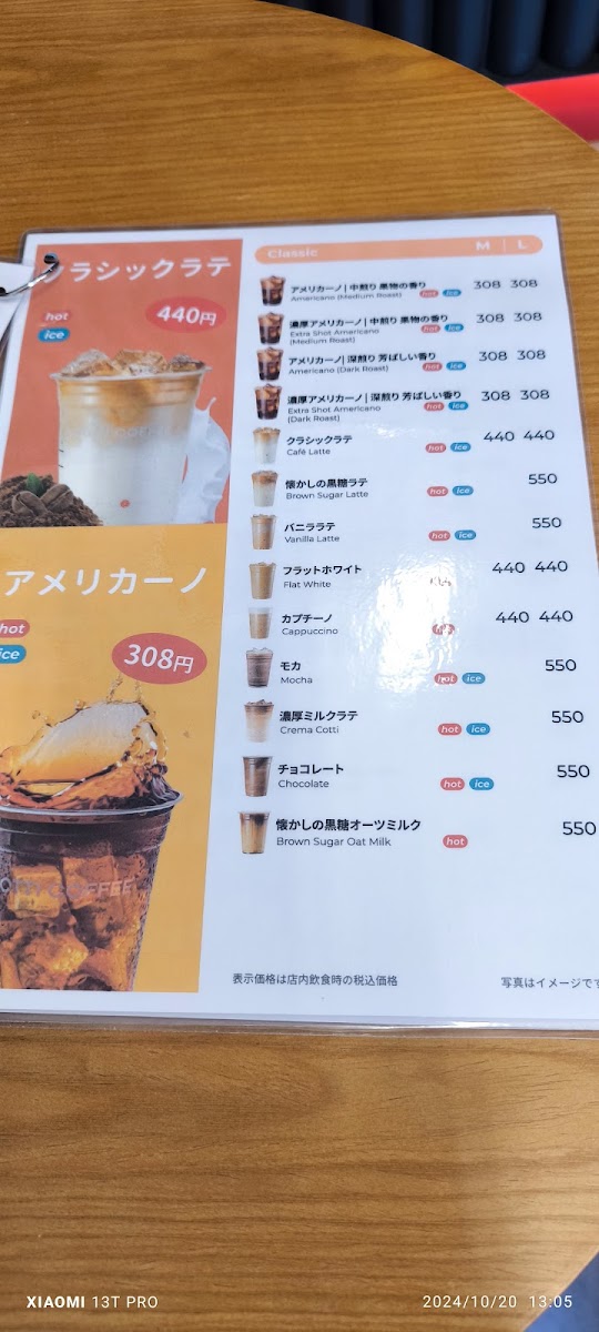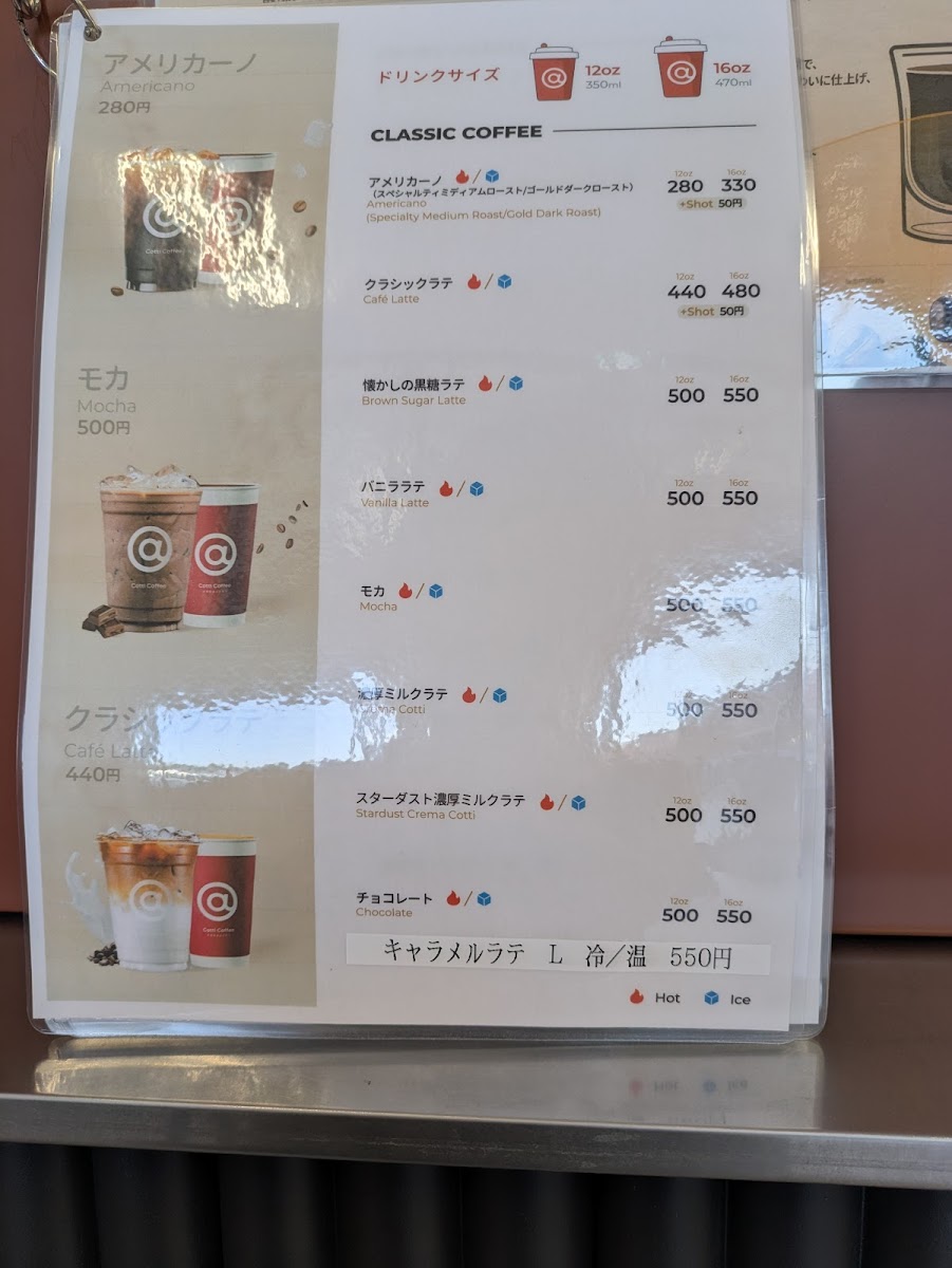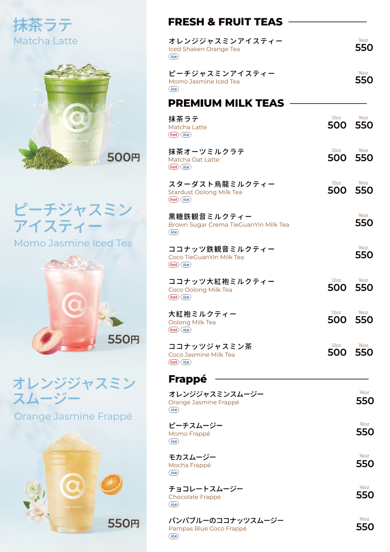 - Coffee and Specialty Beverages: Includes various coffee drinks and lattes, available in sizes around 500–550 yen, with options to customize sweetness.